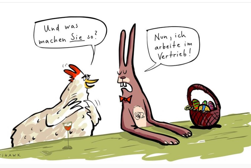 Zwei Hühner stehen vor einem Schaufenster und betrachten Eierbecher. Sagt das eine: „Schicke Kinderwagen haben die hier!“