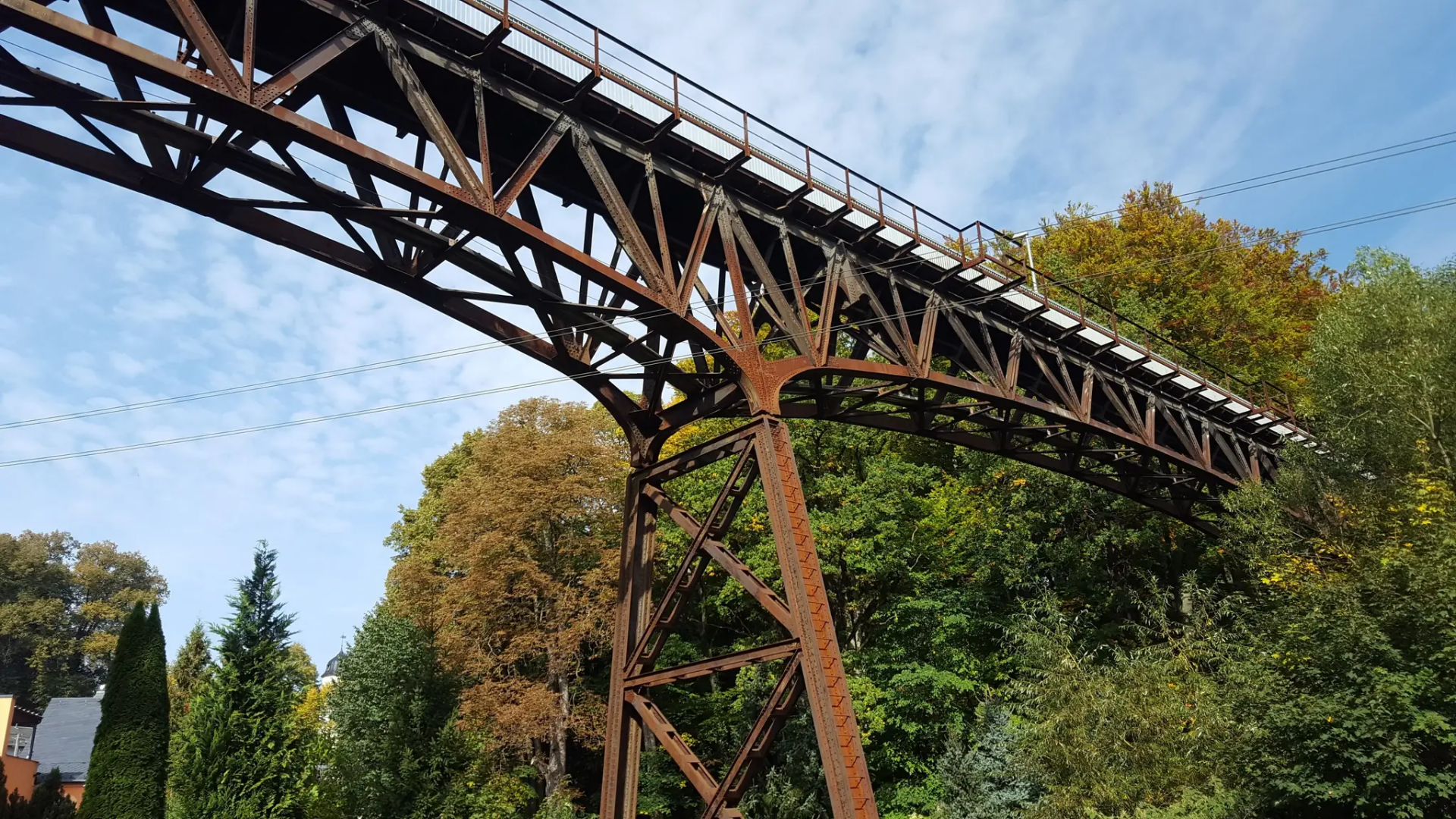 Der Bau des Viadukts erfolgte in den Jahren 1896 und 1897 durch die Königin Marienhütte aus Cainsdorf. Die Baukosten betrugen 190.836 Mark (1871), die Fachwerk-Konstruktion zwischen den gemauerten Widerlagern besteht aus 225 Tonnen Stahl.