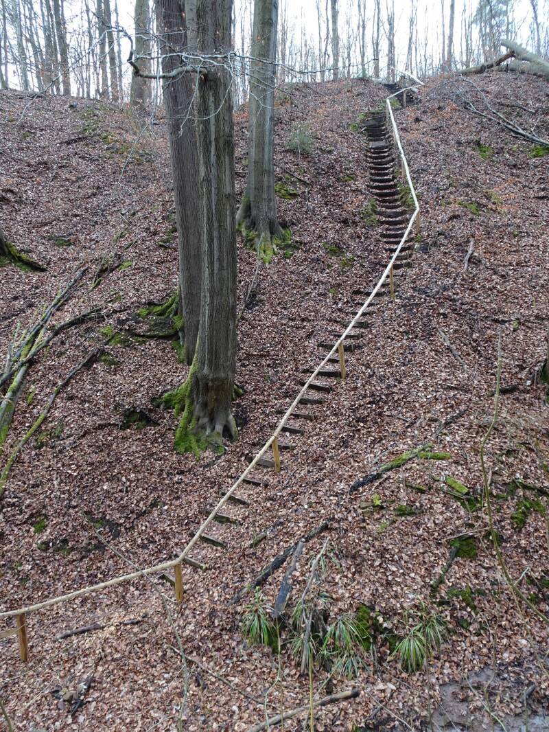 Über eine Holzstiege mit ca. 200 Stufen durchquert man ein steiles Kerbtal genannt die Fuchsklamm. In den Anfangszeiten des Wandertourismus am Beginn des letzten Jahrhunderts, überspannte das Tälchen die sogenannte Hermannsbrücke. Die Hermannsbrücke verband Gera mit der Sommerfrische Ernsee und war eine gewaltige Holzkonstruktion, die aber Wind und Wetter ausgesetzt und mangels entsprechender Wartung (Kriegszeiten 1. Weltkrieg...) keine lange Lebensdauer hatte.